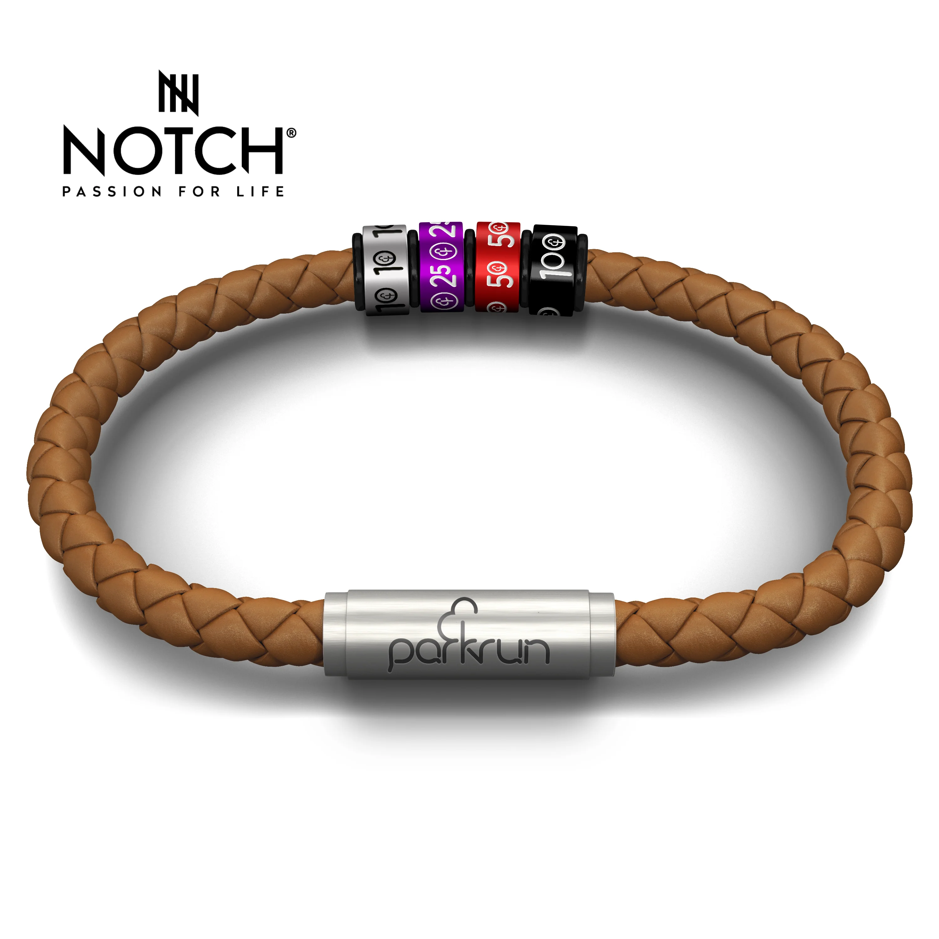 parkrun x NOTCH bracelet made with premium napa leather and featuring a unique stainless-steel clasp, engraved with the parkrun logo; connected by two neodymium magnets, locking together with a safe and secure, super-strong snap.