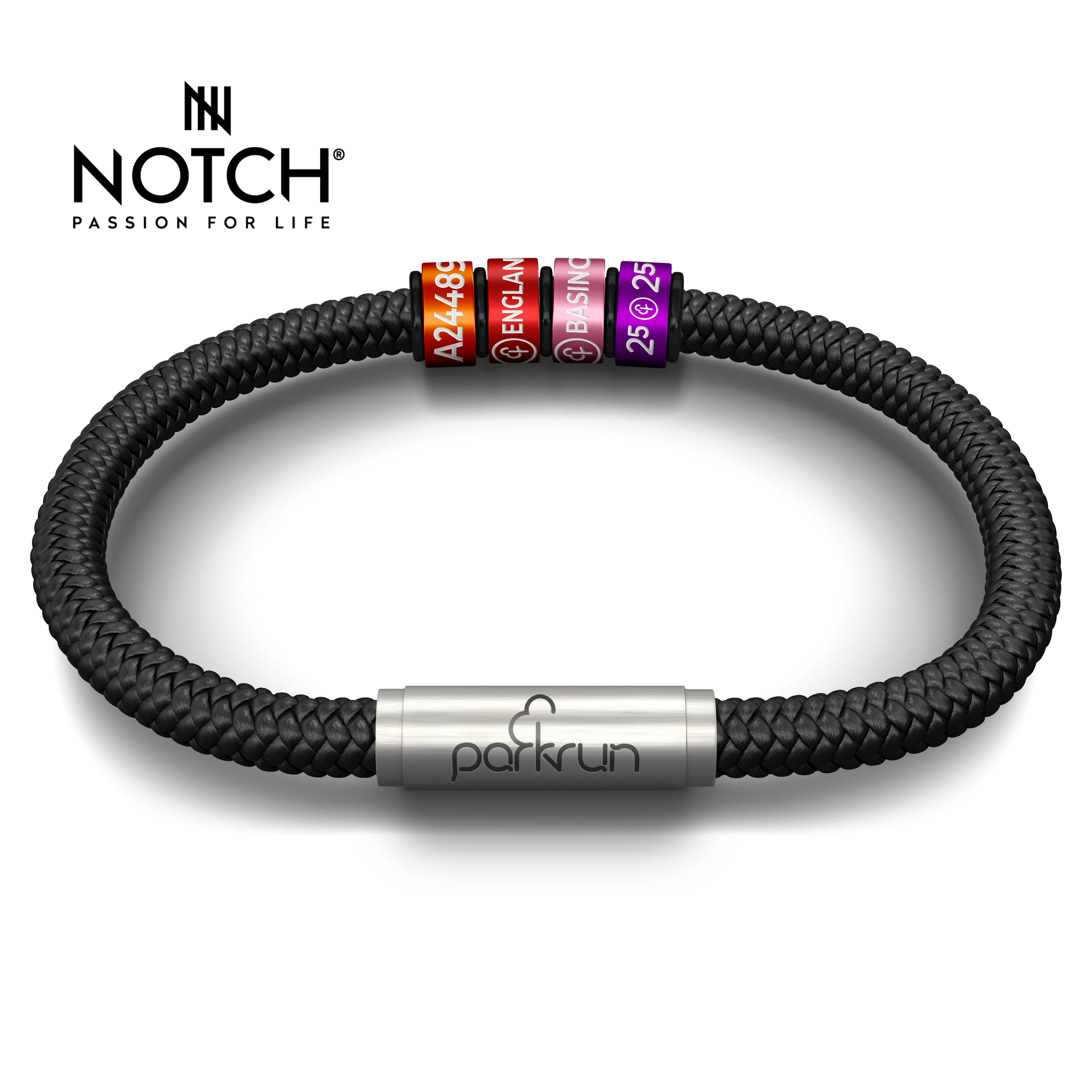 parkrun x NOTCH bracelet made with durable sports cord. The bracelet features a unique stainless-steel clasp, engraved with the parkrun logo; connected by two neodymium magnets, locking together with a safe and secure, super-strong snap.